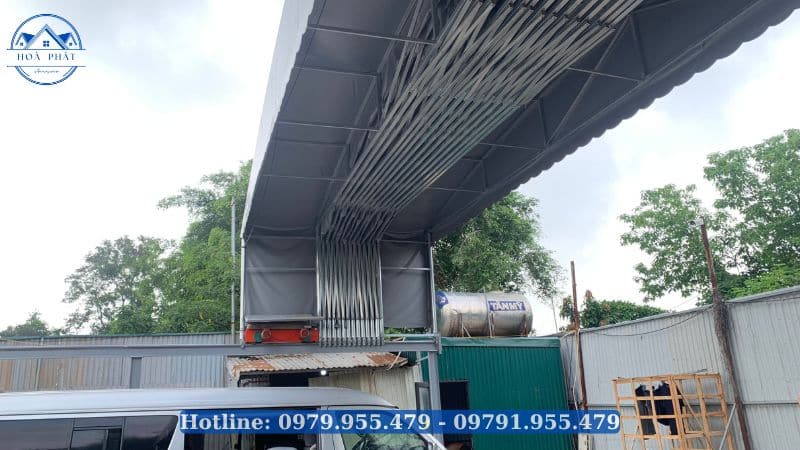 Mái Xếp Hoà Phát thi công hệ mái bạt vòm di động tại kho bãi bốc xếp hàng hoá tại gầm cầu Thanh Trì. Kích thước mái có chiều rộng 10m chiều dài 15m sử dụng hệ thống kéo đẩy tự động bằng motor. Dưới đây là một số hình ảnh quý khách có nhu cầu có thể tham khảo.